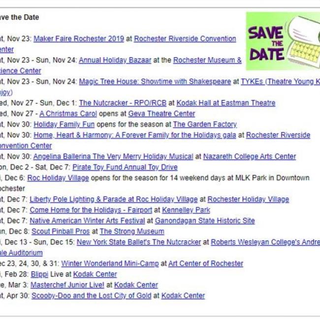 At the top of our weekly e-newsletter is a series of "Save the Date" links that is available to those who have posted an event to the calendar. Save the Date links consist of the title of your event and the location, each linked to the detail page on KidsOutAndAbout.com. Each time you post an event, our system provides a form to order a Save the Date link, or you can contact your customer care representative to order multiple at any time. The cost is $30/week.